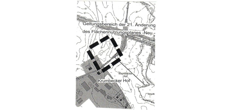 Der Ausschuss für Umwelt, Bauen, Planung und öffentliche Sicherheit hat am 03.07.2018 die Durchführung der Öffentlichkeitsbeteiligung gemäß § 3 Absatz 1 BauGB zur Aufstellung der 21. Änderung des Flächennutzungsplanes -Neuaufstellung- "Krumbecker Hof", für das Gebiet nordwestlich der Straße Krumbecker Hof, nordöstlich des Grundstückes Krumbecker Hof 2 sowie südwestlich des ehemaligen Bahndammes, beschlossen.
