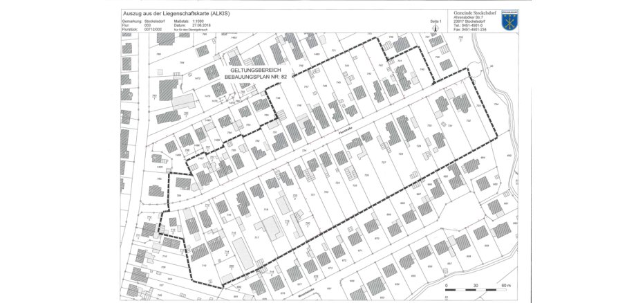 Hier Satzung der Gemeinde Stockelsdorf über die 1. Verlängerung der Veränderungssperre für den sich in der Aufstellung befindenden Bebauungsplan Nummer 82 für das Gebiet nordwestlich und südöstlich der Flurstraße