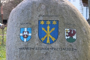 Zum 5-jährigen Bestehen der Partnerschaften, ist vor dem Herrenhaus Stockelsdorf ein Gedenkstein gesetzt worden, den die Wappen der Partnergemeinden zieren. Er soll die enge Partnerschaft zwischen den Gemeinden verdeutlichen.