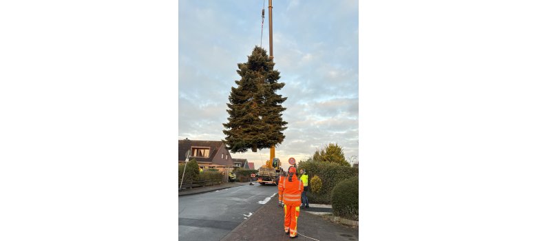 Die Vorbereitungen dafür verlangten den Beteiligten jedoch einiges ab: Am Dienstag, den 25.11.2025, führte die Abnahme der Tanne im Buchenweg sowie das anschließende Aufstellen am Ortseingang zeitweise zu Verkehrsbeeinträchtigungen, denn beides gestaltete sich aufwendiger als zunächst geplant.