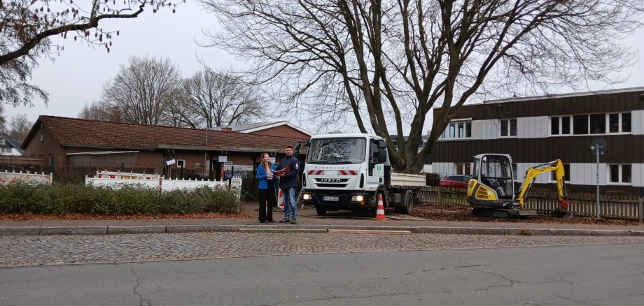 Bauleiter Marc Papendorf von der Gemeinde Stockelsdorf hat nun den offiziellen Startschuss für die Bauarbeiten gegeben. Im ersten Schritt wird die Fläche neben der Bushaltestelle Marienburgstraße abgesperrt. Der bestehende Fahrradunterstand sowie die vorhandenen Fahrradständer werden demontiert. Als Übergangslösung stellt die Gemeinde gegenüber den Gemeindewerken zusätzliche Fahrradständer auf der Grünfläche bereit.