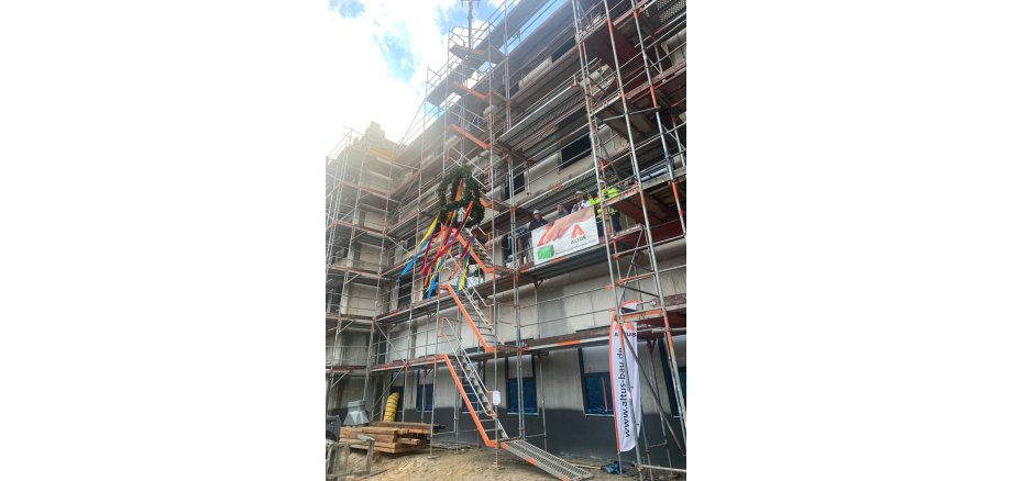 Bauherr Peter Bogenschneider, Inhaber der alpha projektentwicklungsgesellschaft mbH, zeigte sich gemeinsam mit seiner Ehefrau Jutta und seinen Kindern Thies und Lisa zufrieden über den Fortschritt. Im Beisein der beteiligten Planer, der Beschäftigten und Geschäftsleitung der bauausführenden Firma Altus Bau, des zukünftigen Betreibers Ambulantis, von Vertreter:innen der Gemeinde sowie potenziellen zukünftigen Bewohner:innen würdigte er die enge Zusammenarbeit aller Beteiligten.