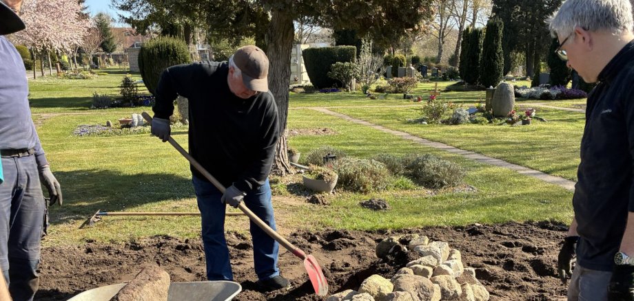 Bei freundlichem Frühlingswetter und strahlendem Sonnenschein gelang dem Team – mit tatkräftiger Unterstützung des Friedhofs- beziehungsweise der Kirchengemeinde – ein großer Fortschritt. Alle Beteiligten haben hervorragend zusammengearbeitet und damit eine richtig positive, produktive Stimmung geschaffen.