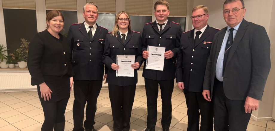 Im Rahmen der Versammlung wurden mehrere Beförderungen ausgesprochen: Charlotte Hinz wurde zur Feuerwehrfrau (FF) befördert, Justus Matthusen zum Feuerwehrmann (FM) und Ulric Liebholz zum Hauptfeuerwehrmann mit zwei Sternen (HFM 2).