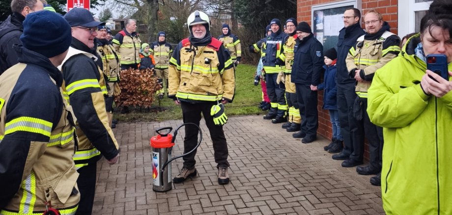 Rund 40 Gäste begleiteten diesen Schritt im Feuerwehrgerätehaus Arfrade. Bei Grillwurst und Früchtepunsch feierten Kameradinnen und Kameraden aus allen Stockelsdorfer Wehren, der Freiwilligen Feuerwehr Eutin sowie der 9. Feuerwehrbereitschaft des Kreisfeuerwehrverbandes Ostholstein gemeinsam mit Wolfgang Steen diesen besonderen Moment.